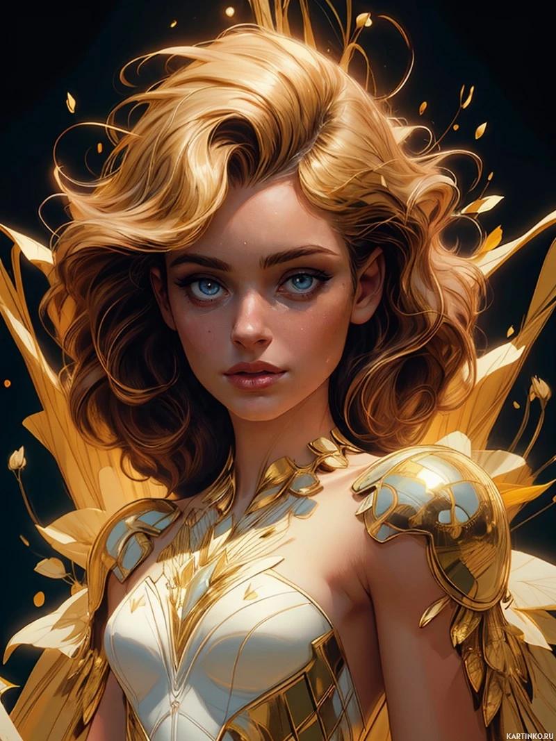 blonde hair that cascades down her shoulders. Her skin is fair, and she wears makeup with accentuated eyelashes and