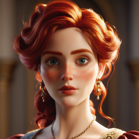 red hair styled in loose curls. She has