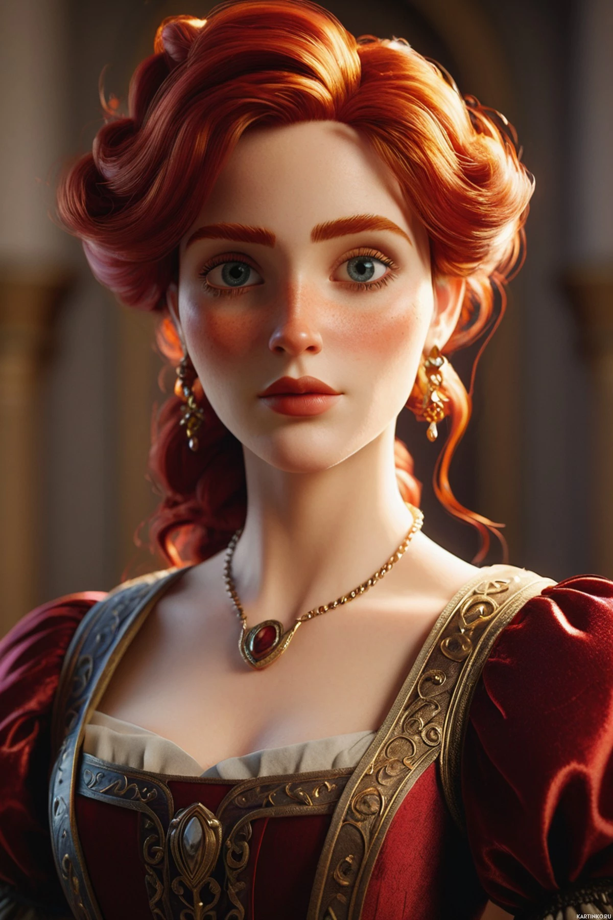 historical attire that suggests a setting in a different era, possibly Renaissance or medieval based on the style of the clothing. The outfit includes a red gown with puffy sleeves and