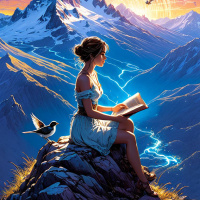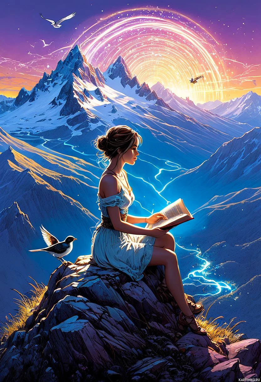 a young woman sitting on a rocky outcrop. She appears to be reading a book that she holds in her hands. The landscape around her is majestic and serene, featuring snow-