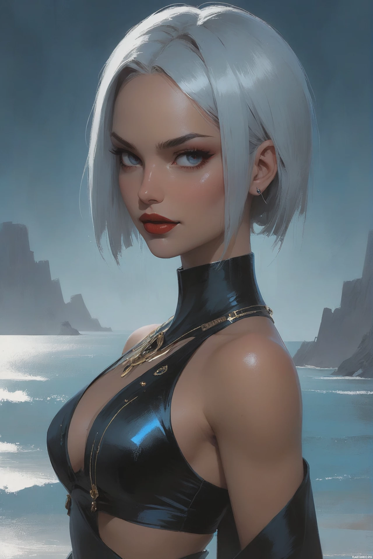 a coastal scene with cliffs and waves, hinting at a setting perhaps related to her character's narrative or origin. The overall impression is that of a polished piece of
