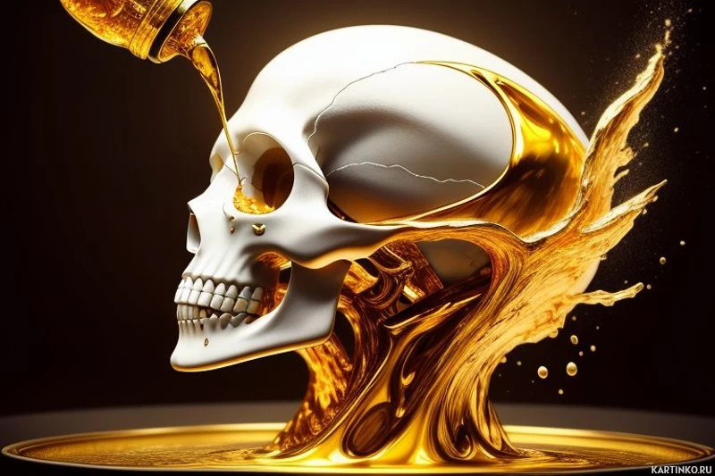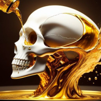 the golden skull and its surroundings. There are also elements of what looks like molten or liquid gold flying away from the skull, adding