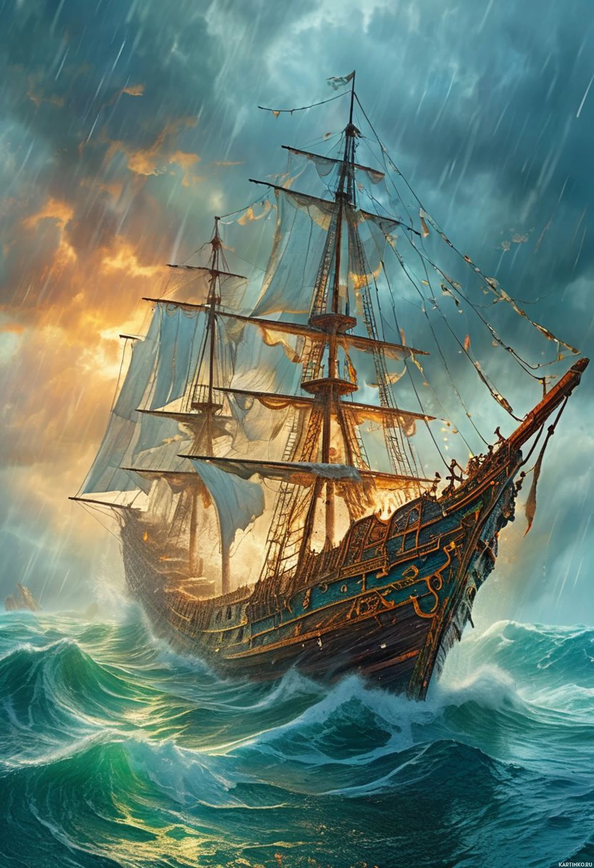 a sailing ship. The ship is depicted in dynamic motion on