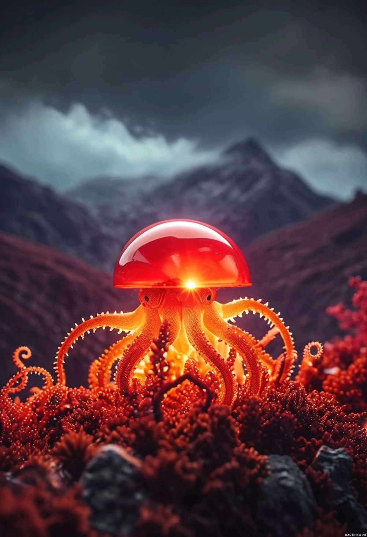 a fantastical scene featuring an octopus. The octopus, with its vibrant red and orange colors, is sitting atop a rock on the left side of the frame. It appears to be glowing from within, giving it an almost magical or mystical quality. The background presents a dramatic mountainous landscape under