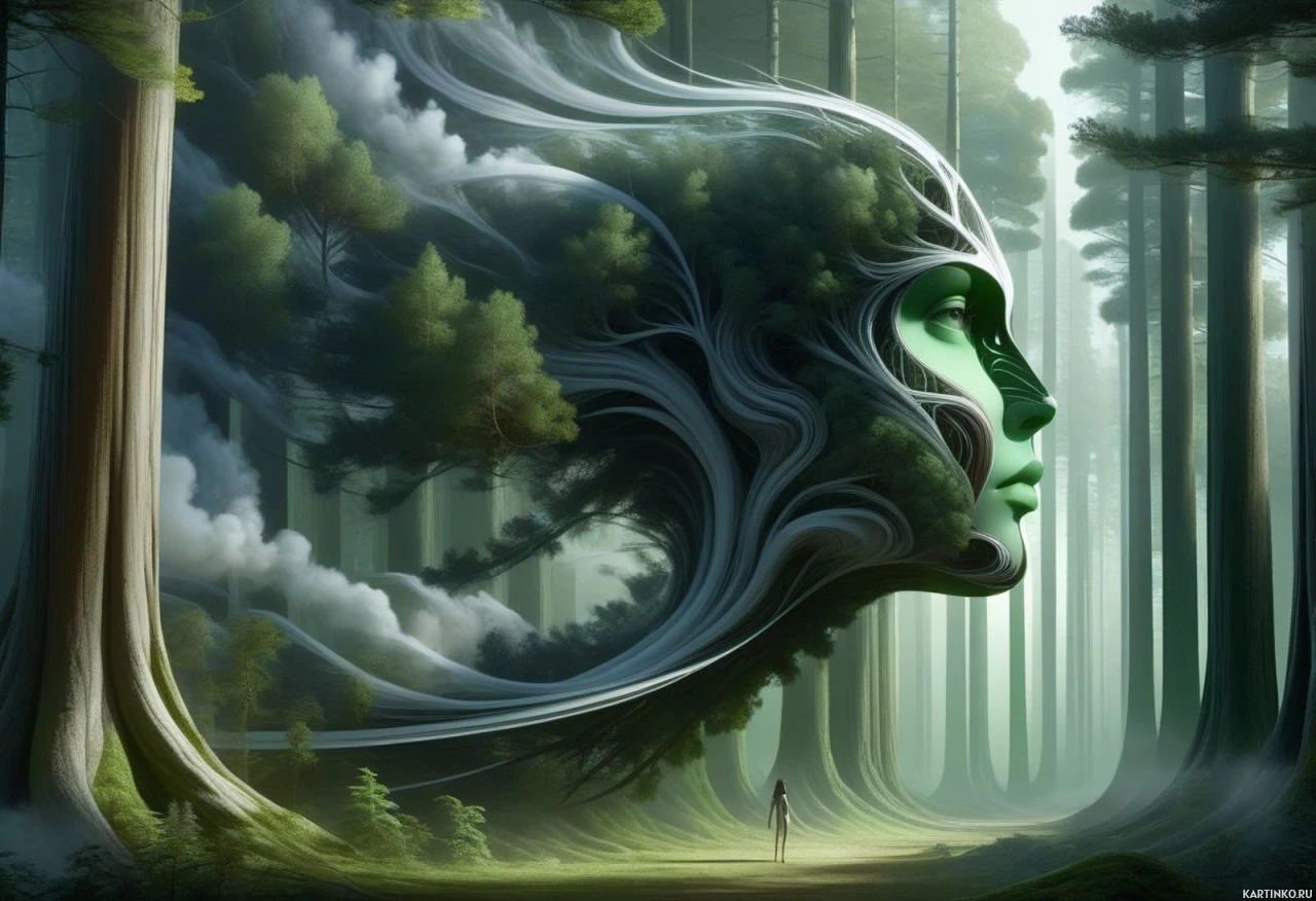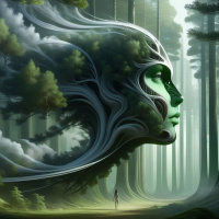 forest scene. A central figure is a human face that merges seamlessly with the surrounding flora, creating an illusion of one being part of