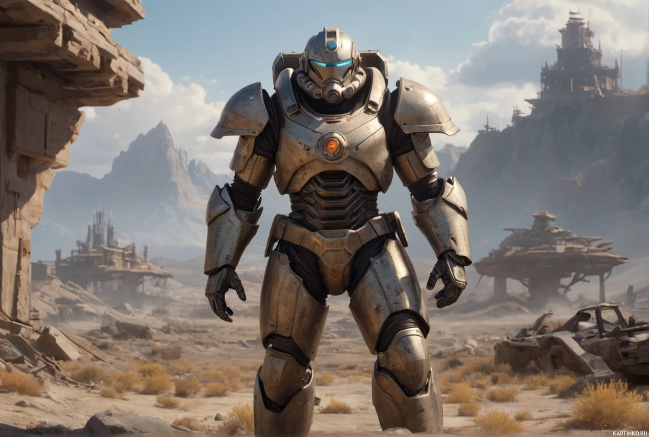 a futuristic armor that includes a helmet with visors. The armor has