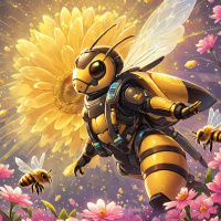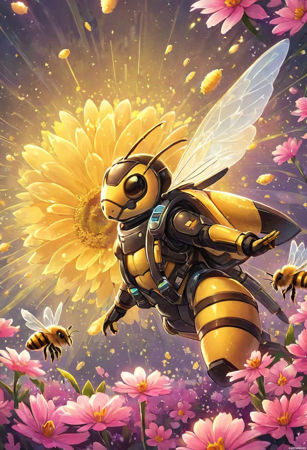 pink flowers and other smaller bees, suggesting an ecosystem in harmony. The background features a large, bright sun-like object radiating outward, which contributes to the overall fantastical and