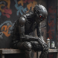 red eyes, suggesting it may be part of the Terminator series due to its resemblance to the character played by Arnold Schwarzenegger in the movies. It is sitting on what appears to be a bench or a makeshift seat with its legs crossed at the knees and hands resting on its thighs, giving an impression of human-like posture and emotion. The robot's posture conveys