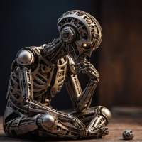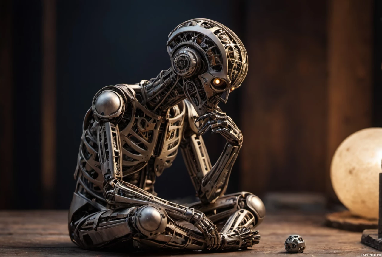 science fiction, featuring a robot in a human-like pose. The robot has