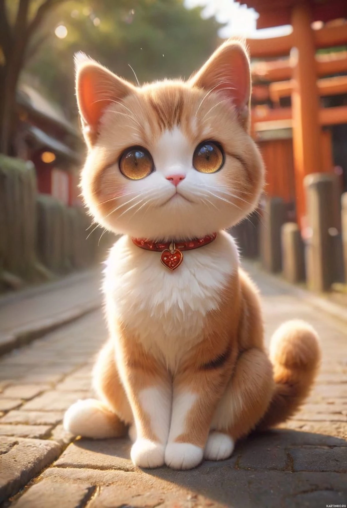 blue eyes and is wearing a red collar with a gold-colored charm. The cat appears to be sitting on a brick pathway, which could suggest it's in an urban or semi-