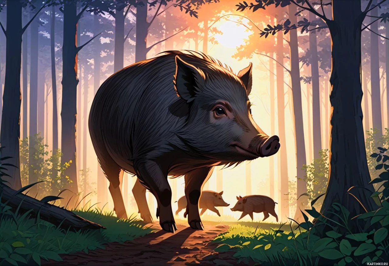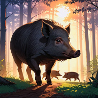 long shadows on the ground. The light creates a serene and almost mystical atmosphere within the forest. The overall composition of the image conveys a sense of tranquility and natural beauty, with the boar as the focal point amidst the verdant surroundings.