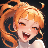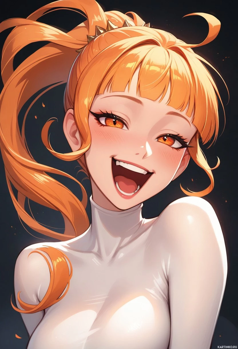 expressive eyes with pupils shaped like hearts and a cheerful expression on her face, which includes a wide smile revealing her teeth. Her attire consists of