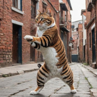 distinct stripes on its fur, characteristic of a tiger, which may suggest that it is a Bengal cat, known for their unique and beautiful striped patterns. The image captures a moment of anthropomorphic behavior, making the cat look like it's dancing or performing a trick with its paws raised in
