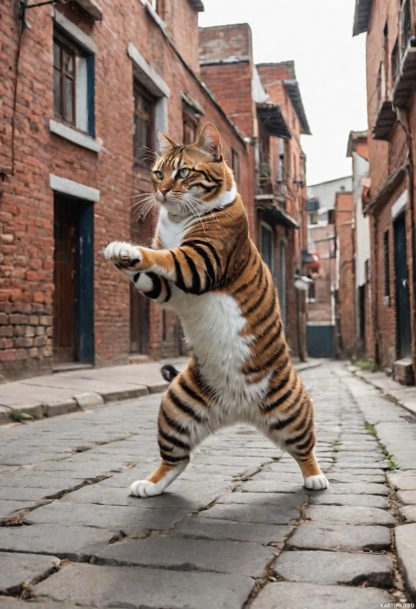 hind legs. The cat is positioned on a brick road or walkway, which appears to be part of