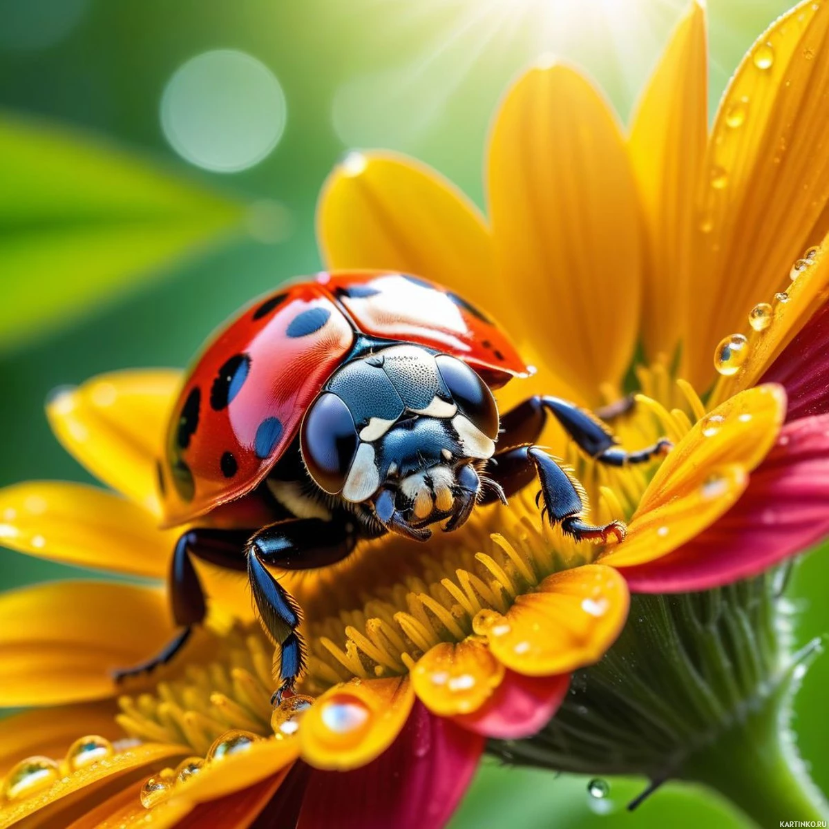 The image features a ladybug resting on the head of a flower. The ladybug is adorned with its distinctive red and black coloration, with several spots on its wings. It's positioned in such a way that it appears to be gazing into the camera, giving