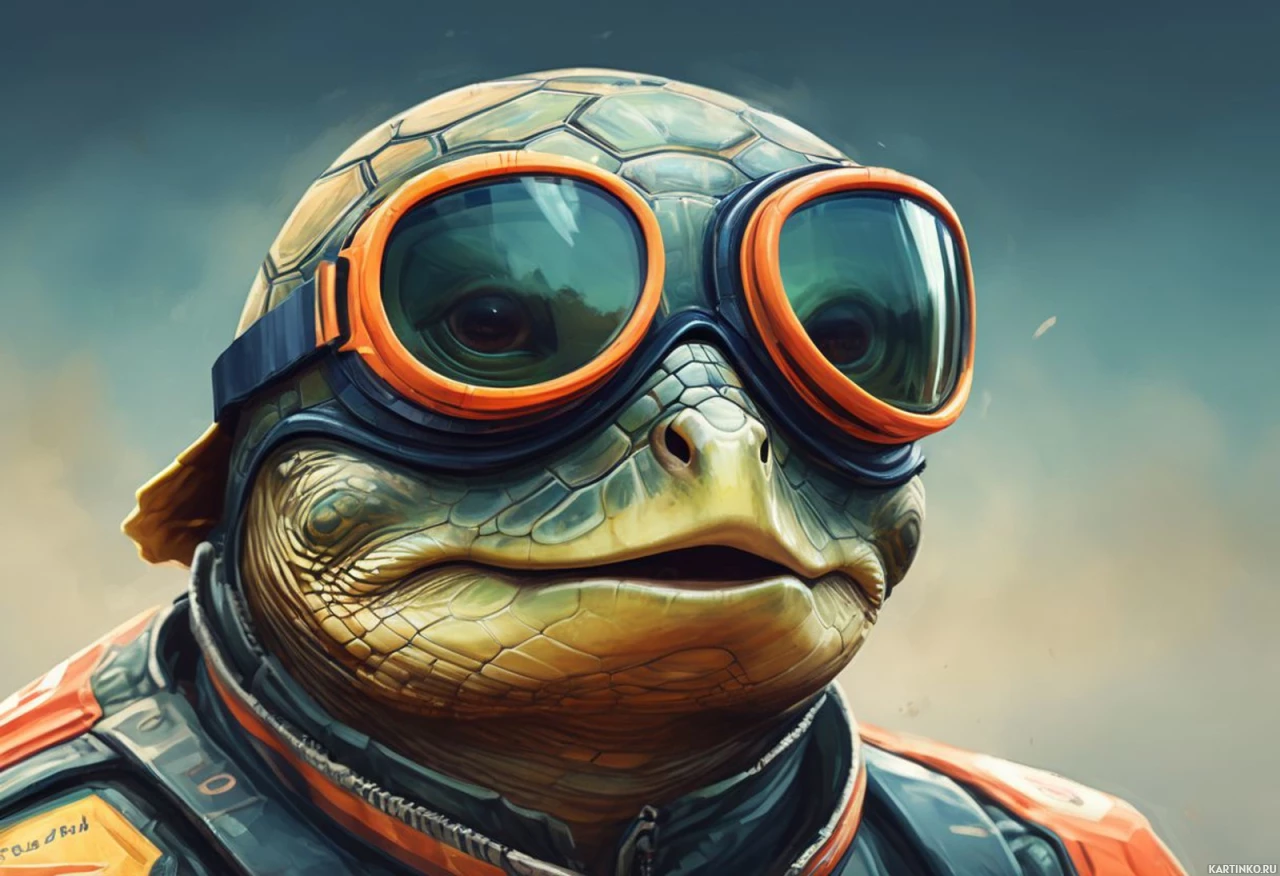 turtle character. This character is wearing a pair of orange goggles and has