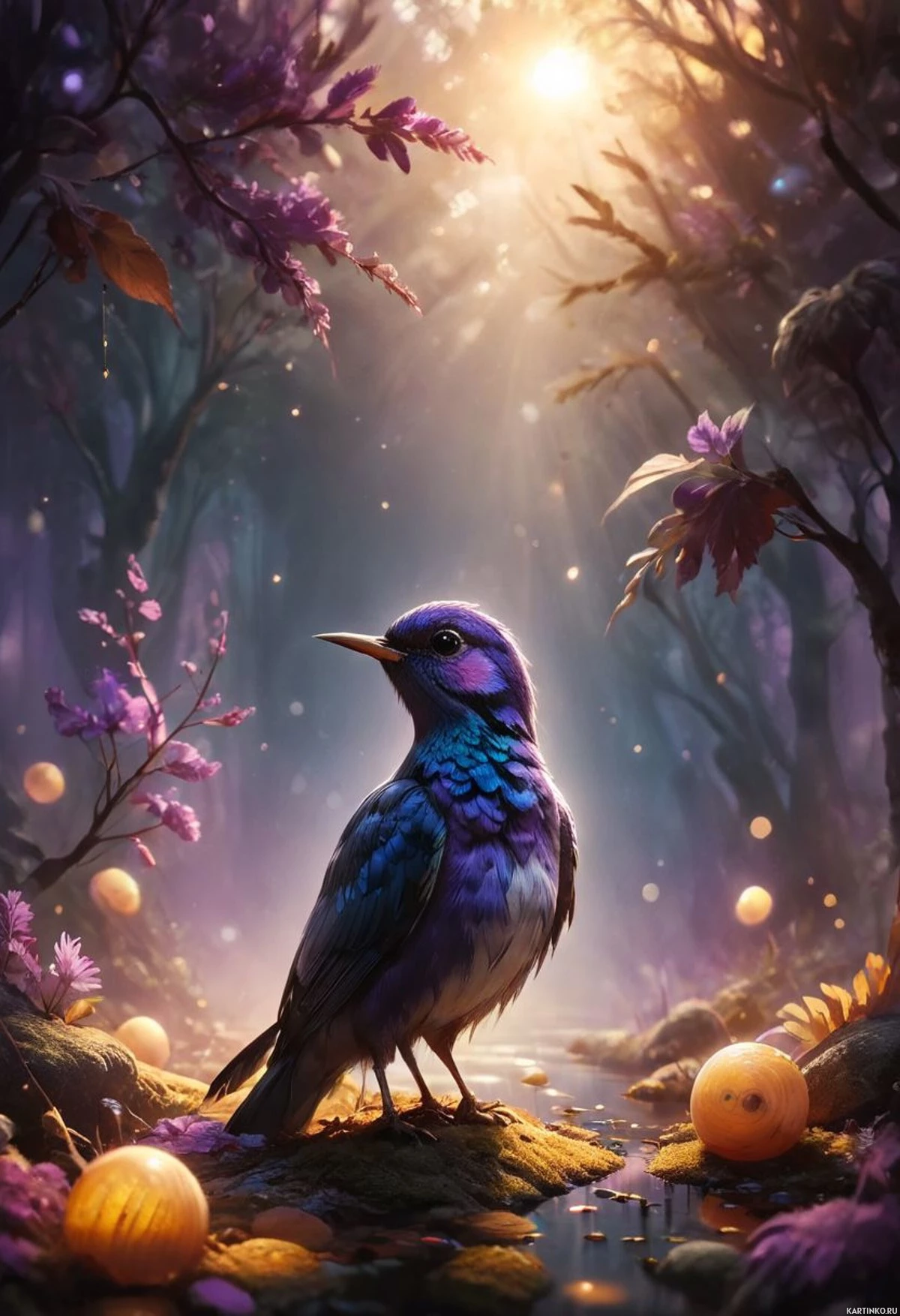 blue plumage and is standing on one leg, is facing towards the right side of the image where there appears to be light emanating from behind it. The background features
