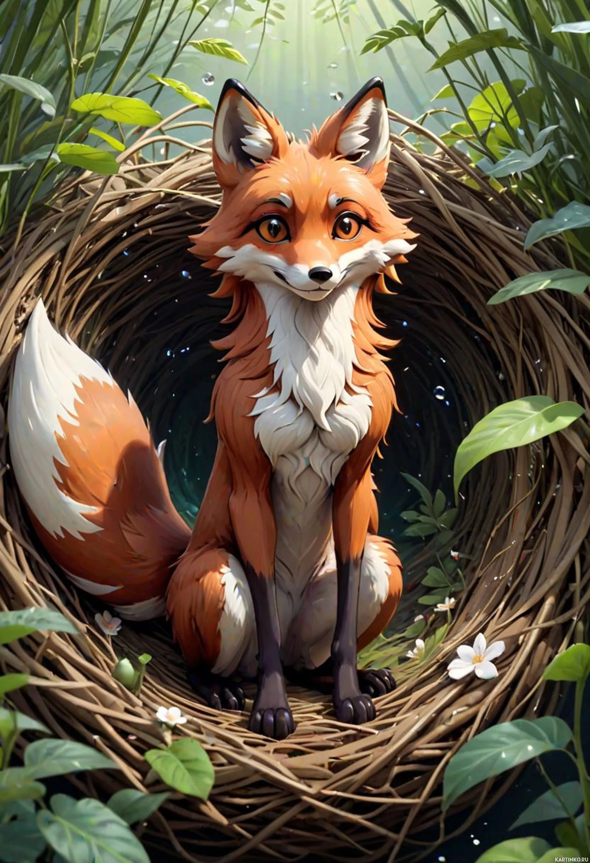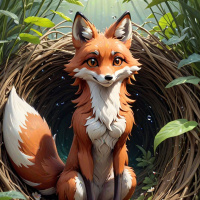 lush greenery with tall grasses and what looks like a small waterfall or stream. There is also a hint of a moonlit night sky in the upper left corner, suggesting an evening setting. The image is rich in detail, giving it a magical and serene atmosphere. The fox seems to be at peace within this natural environment.