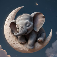 The image depicts a baby elephant sitting on a crescent moon, with its eyes closed as if it is sleeping. The background is dark blue with stars and clouds, giving the impression of night sky.