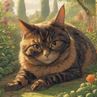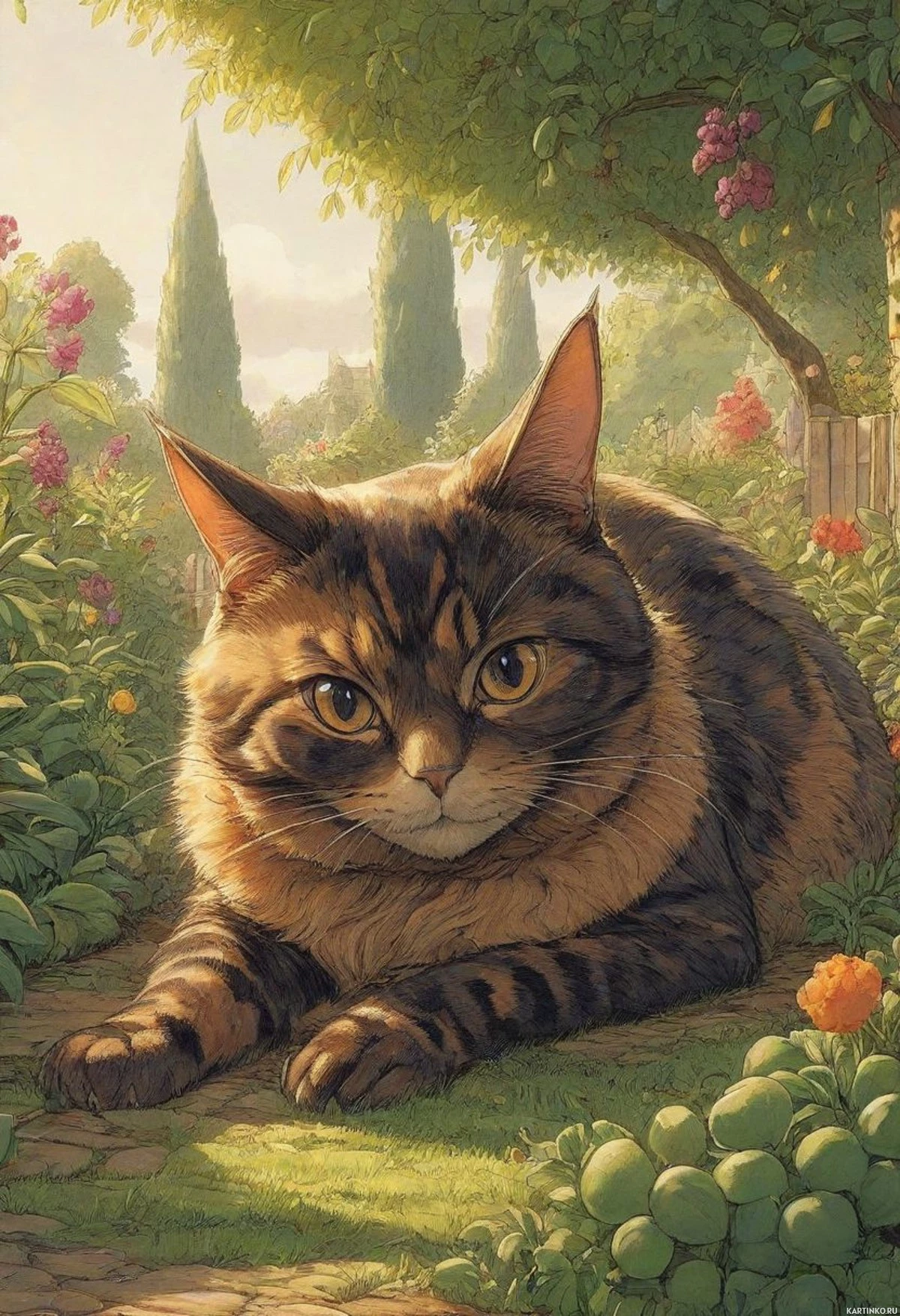 lush greenery, including trees, bushes, and flowers that contribute to the peaceful ambiance of the scene. The tiger is situated on what appears to be