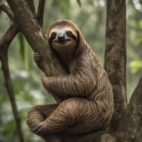 На картинке ленивец сидит на ветке дерева. Он цепляется передними лапами за ветку, а его спина и хвост немного видны на фоне листвы. Кажется, ему очень удобно и он наслаждается своим местом.