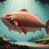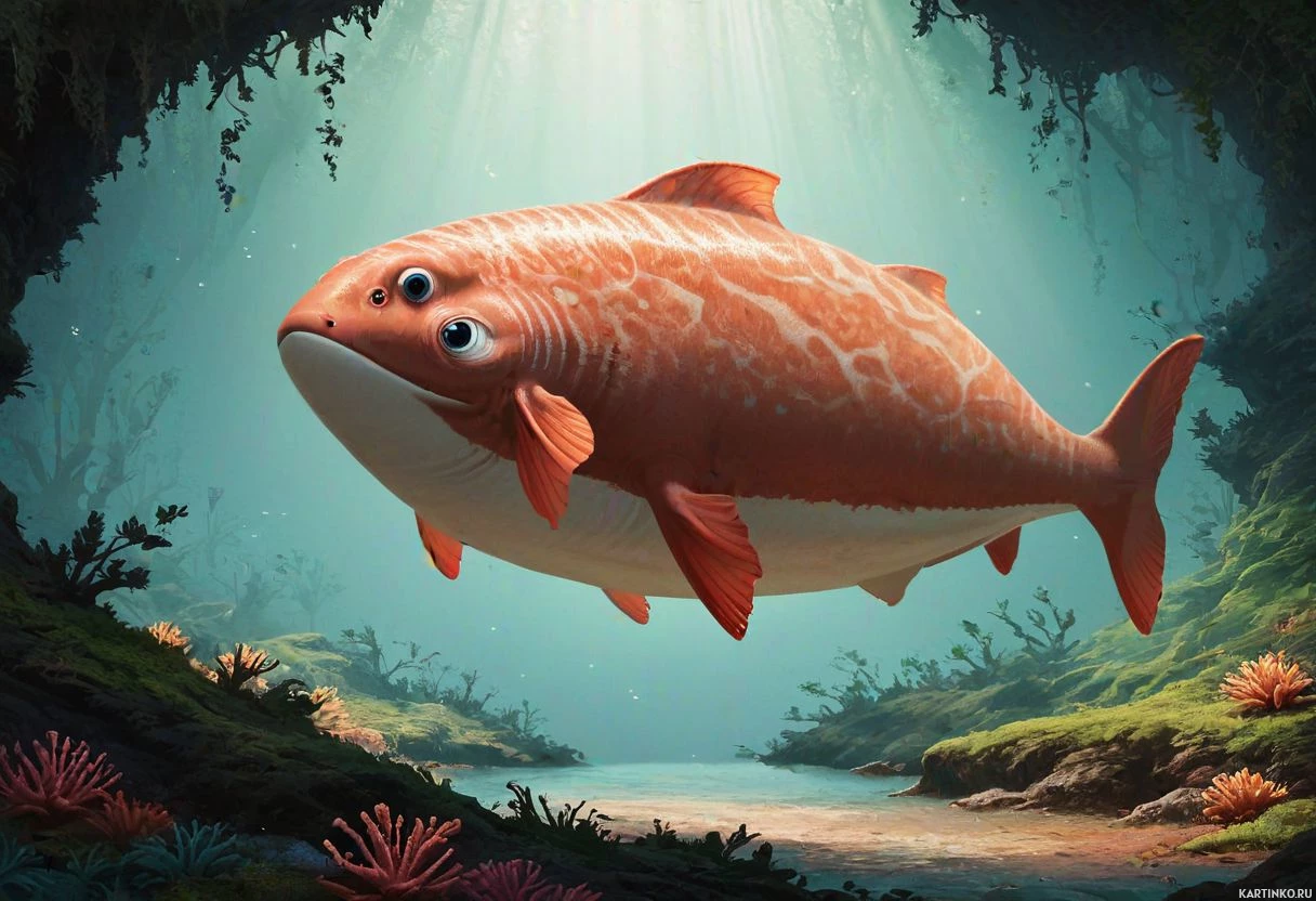 shades of orange and white, and it appears to be swimming through an underwater cave or passageway. On either side of the fish are darker