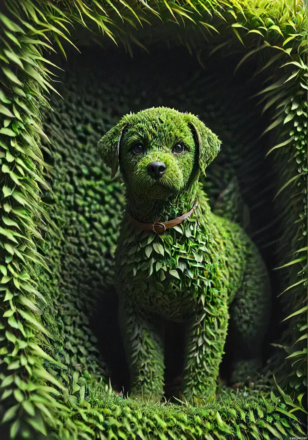 visual effect, where the dog appears to be made of plants or foliage itself. The background suggests a jungle-like environment, possibly within some sort of enclosure or tunnel. The overall composition is highly stylized and artistic in nature, blending elements of