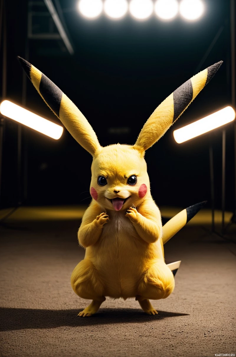 lights in the background, suggesting that this could be a promotional event or media appearance for Pokémon. Pikachu's