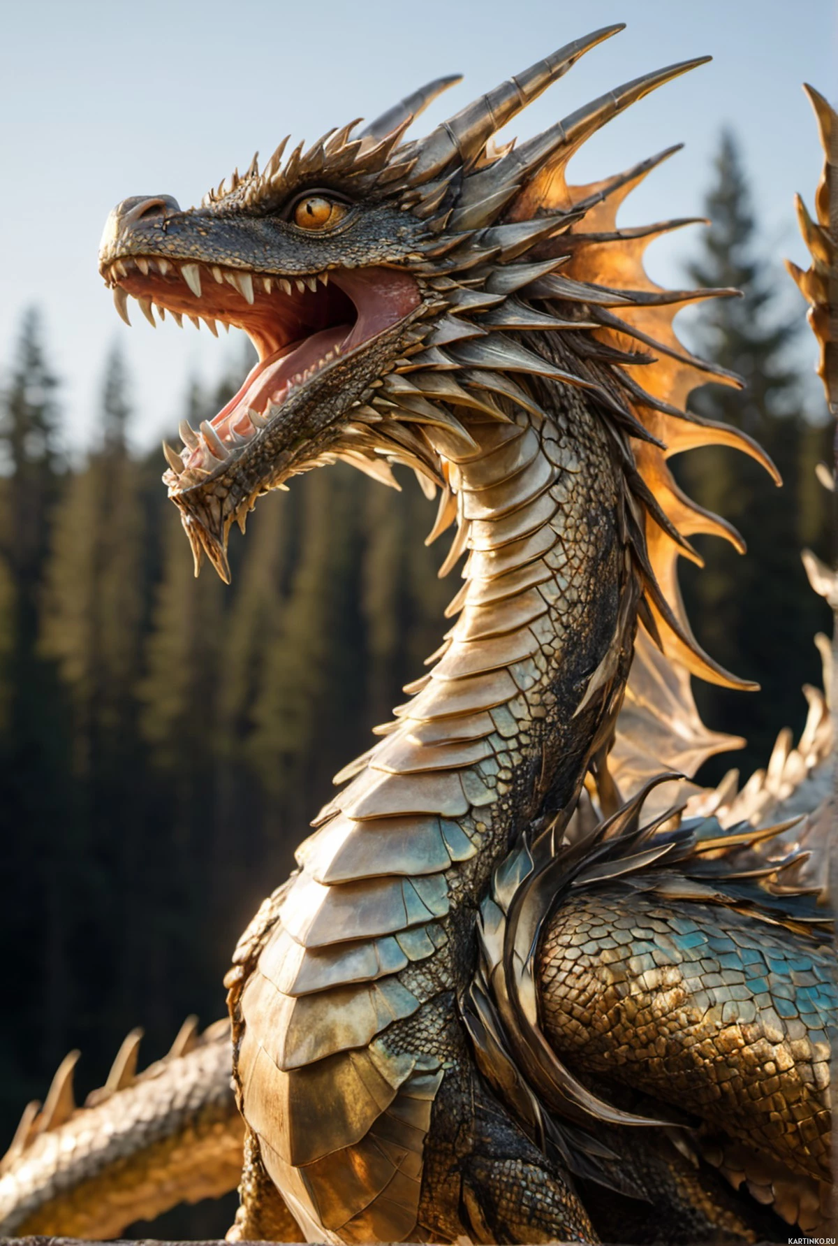 tall trees visible in the background, which adds to the mythical atmosphere.