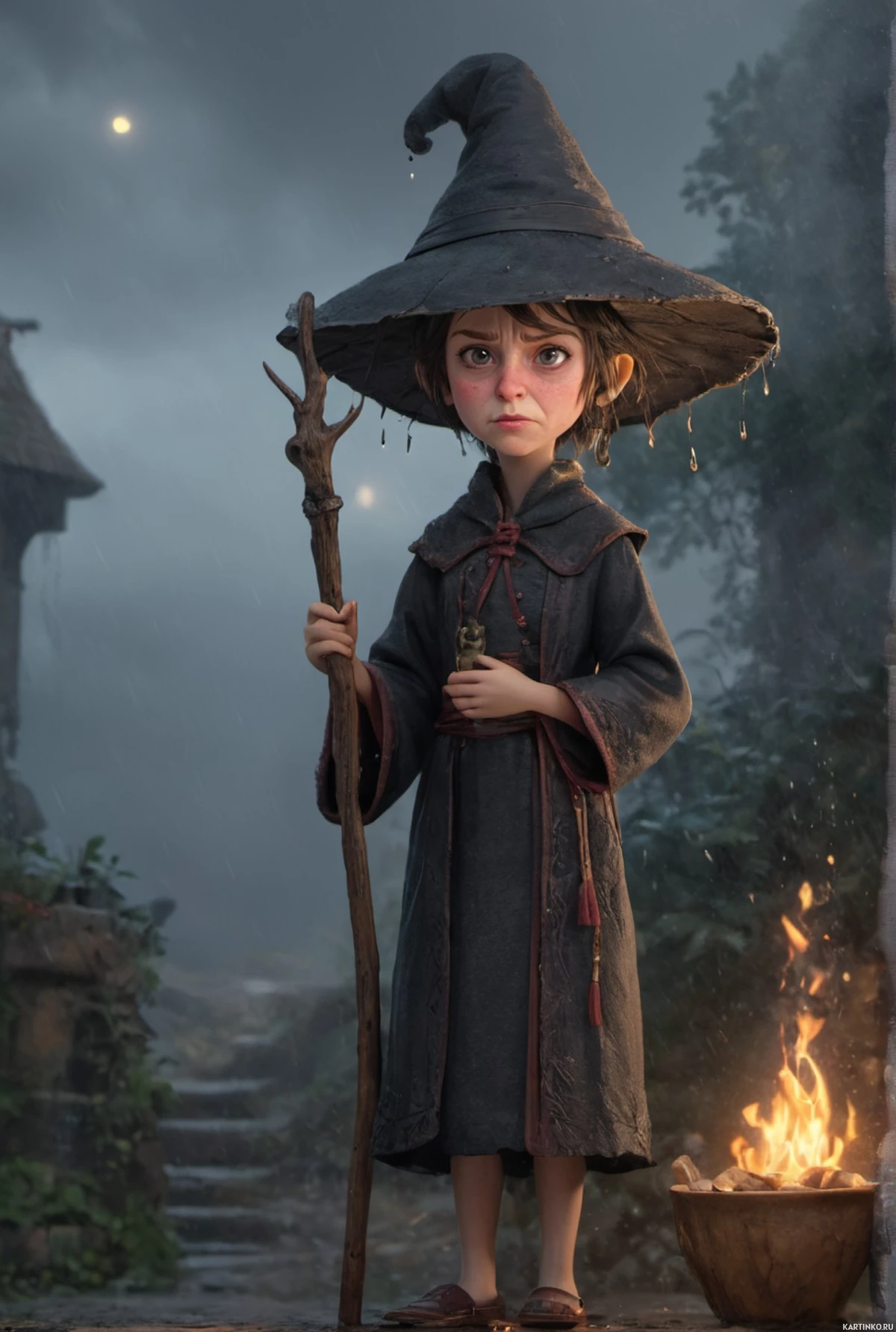 witch hat on her head. Her expression is somewhat distressed or worried, and she holds