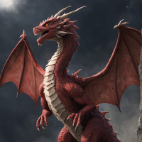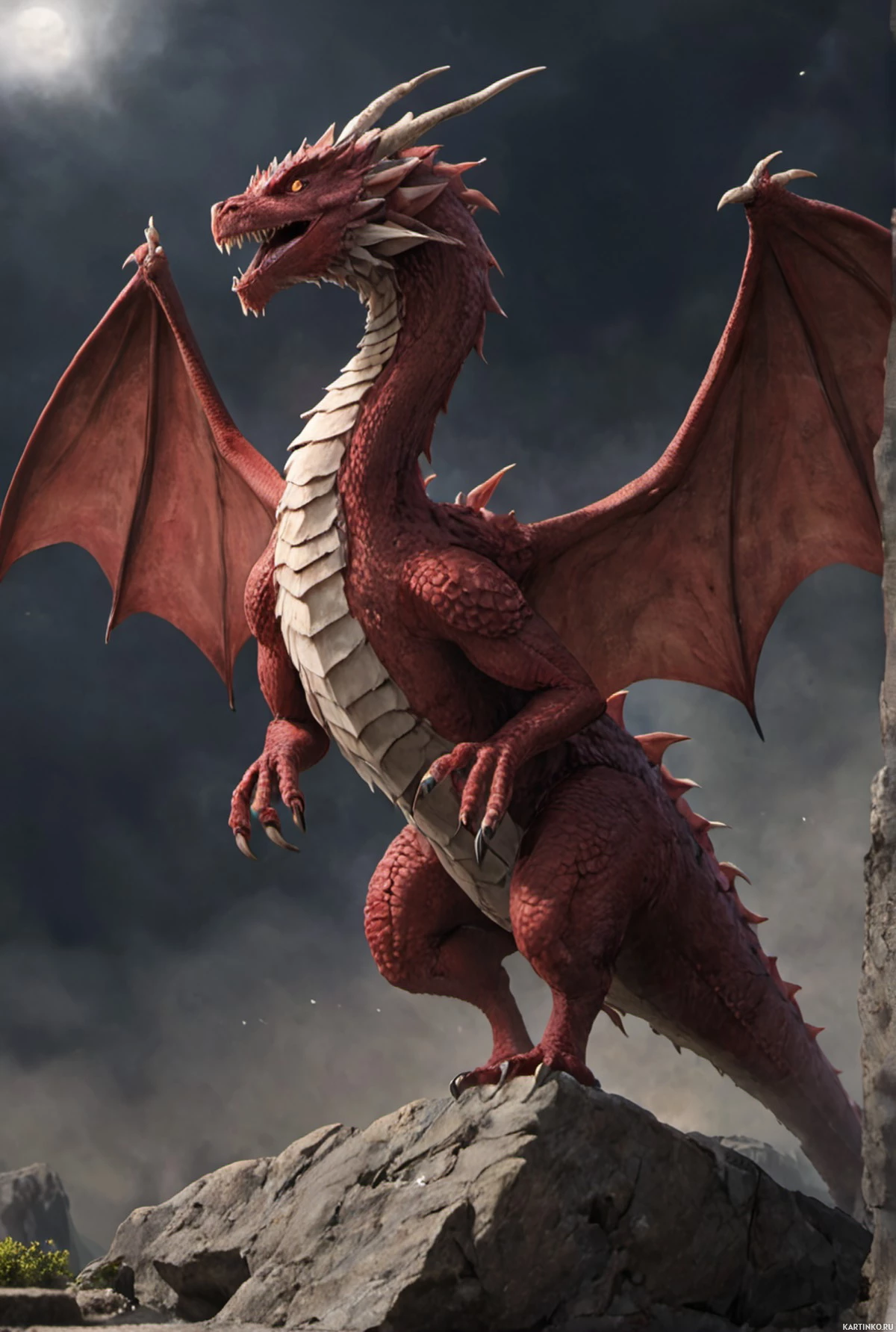 a fantasy scene featuring a red dragon standing on a rocky outcrop. The dragon has