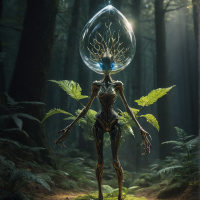 a sense of otherworldliness, possibly suggesting themes related to technology in nature or fantasy elements blending with realistic scenery.