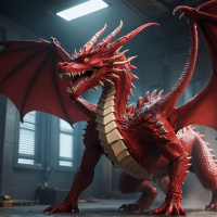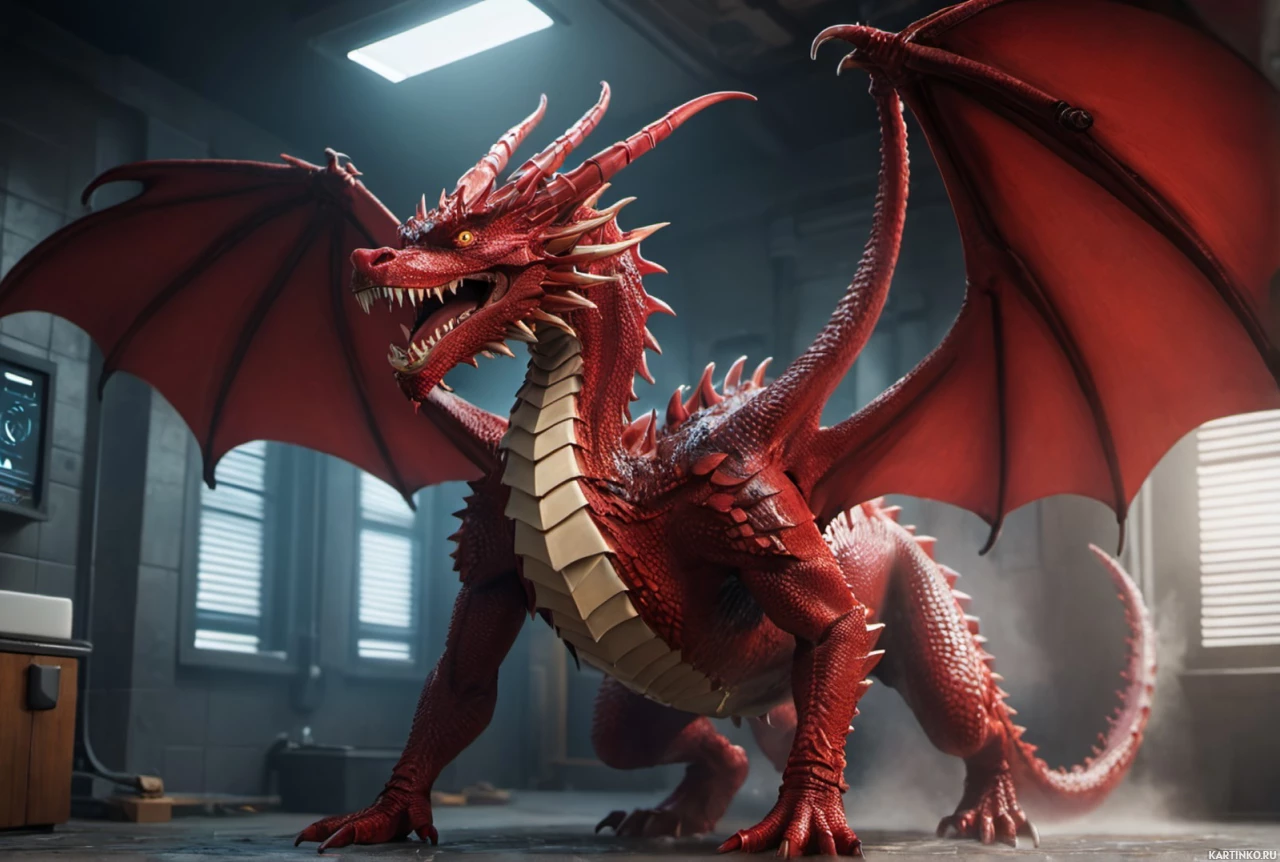 red scales, white eyes, and is exhibiting a pose as if it's ready for combat. The dragon takes up
