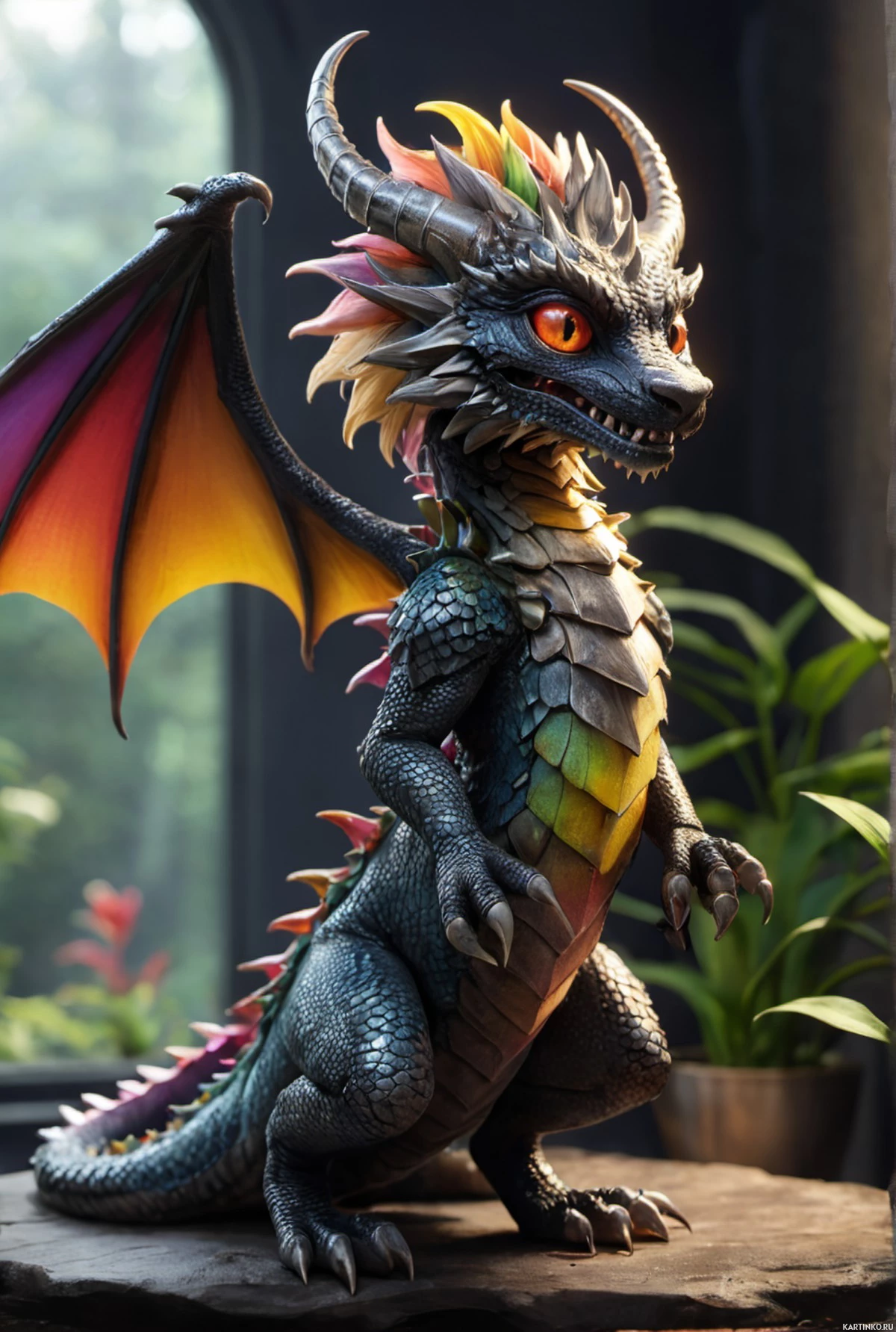 front legs are slightly forward and its body leans slightly forward. The environment around the dragon is a dimly lit interior, possibly a workshop or museum setting, with a few plants and potted plants visible in the background, which adds to the authenticity of the display. The image does not contain any texts or include any requests for information. It is a straightforward depiction of a fantasy-themed dragon model.