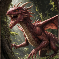 green moss and plants, indicating a damp and humid environment typical of such forest settings. The overall style of the image is illustrative, with rich textures and colors designed to evoke a sense of fantasy and mystery. The dragon's posture and expression contribute to this atmospheric effect by conveying an impression of strength and mythical power.