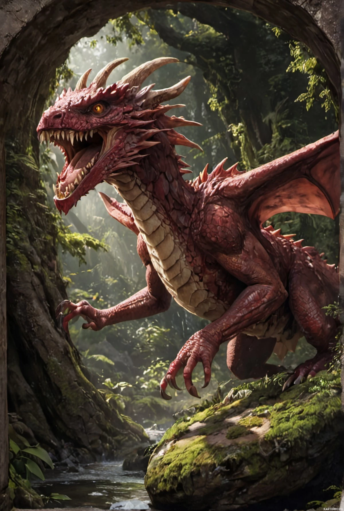 spiky horns on its head and is opening its mouth wide, perhaps to roar or breathe fire. The creature's scales are reddish-orange, suggesting it might be an embodiment of a dragon from mythology or fantasy lore. The background features what looks like the entrance to a cave or