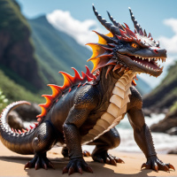 a small body of water visible near the creature's feet, which could be interpreted as an ocean or sea shore. The overall composition of the image conveys