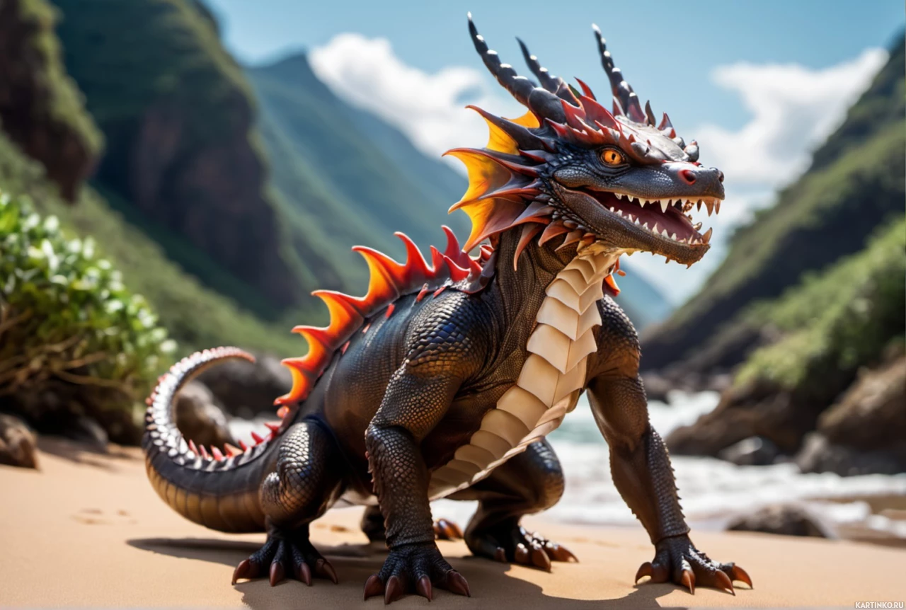 In the image, there is a creature that appears to be a hybrid between a human and a dragon. It has