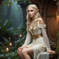 fantasy costume that suggests a medieval or otherworldly character, commonly associated with elves from various mythological or fantasy tales. Her attire includes flowing garments that drape elegantly around her, complemented by accessories that enhance