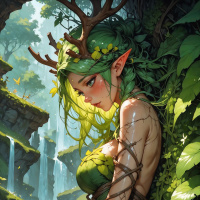 a prominent nose and is wearing a simple leaf garment that complements the nature-inspired theme of her surroundings. The background depicts a lush, verdant
