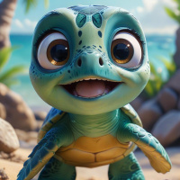 The image features a cartoon turtle character. It is styled with a friendly and cheerful expression, standing on what appears to be sand at the beach, with palm trees in the background and a clear sky above.