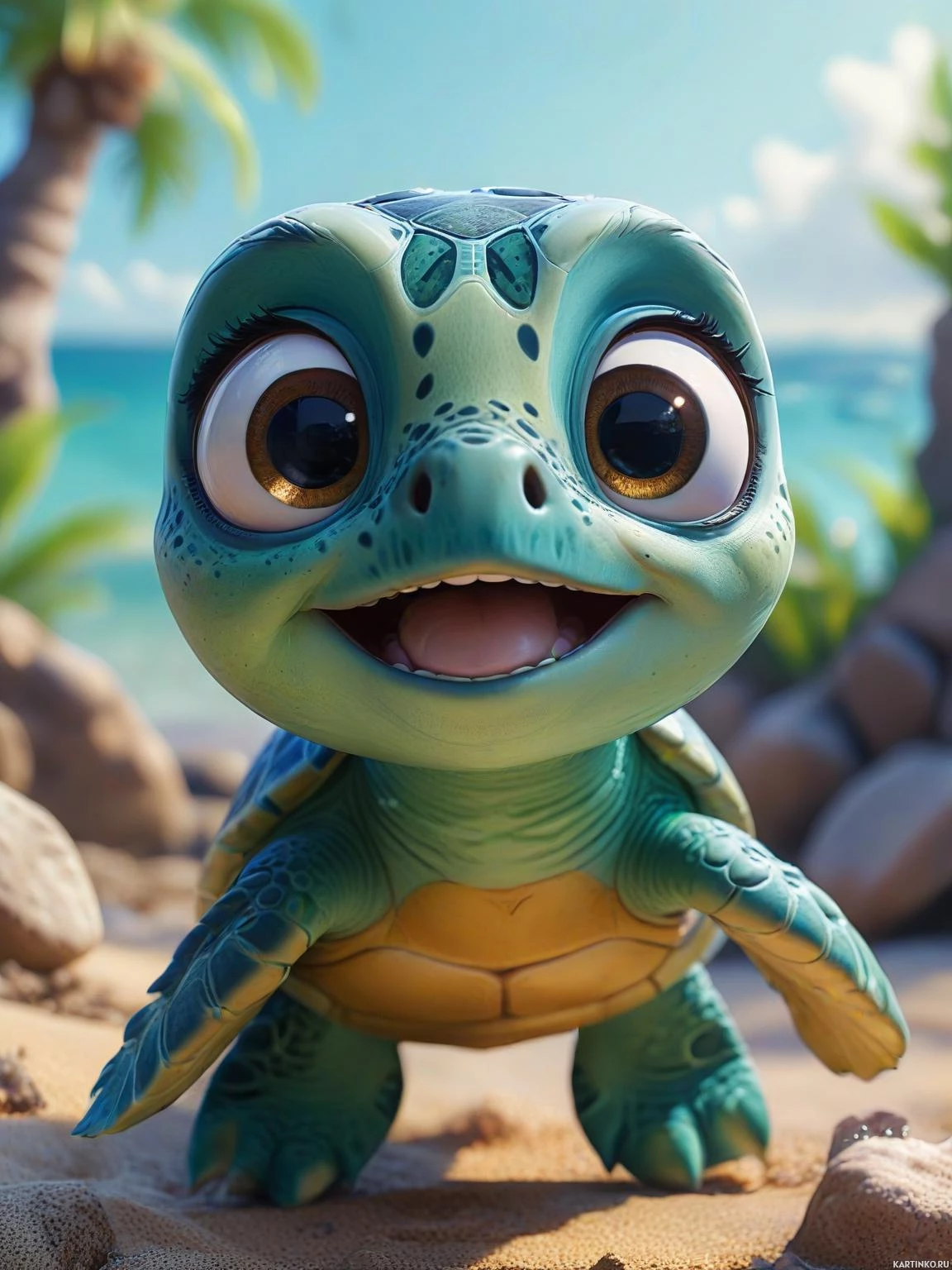 На картинке изображен мультяшный черепашонок. У него доброе и веселое выражение мордочки. Он стоит, кажется, на песке на пляже, на заднем плане видны пальмы и чистое небо.