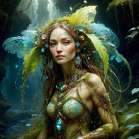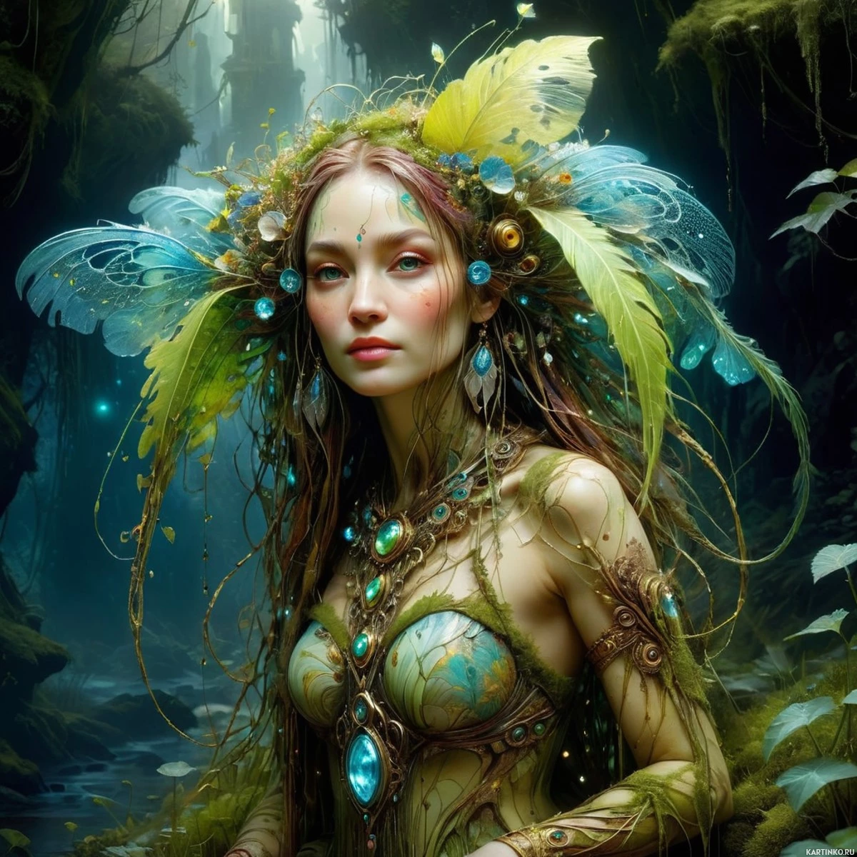 the large wings protruding from her back, which are feathered and have a mix of blues and greens. Her hair has green feathers incorporated into it. She is wearing an elaborate headpiece made up of various floral elements in shades of blue, yellow, and green, with some red accents. Additionally, there are crystal-like embellishments scattered across her face and body. Her attire includes a corset-style top with a detailed design that features leaves and vines. The background is fantasy-themed with a castle perched on a rocky outcropping to the right side of the image, and a forest can be seen in the distance with trees and foliage that have a somewhat otherworldly appearance due to their elongated shapes and the presence of what appear to be small, shimmering lights. The overall atmosphere is one of enchantment and magical realism, likely designed to evoke a sense of wonder or mysticism in the viewer.