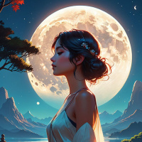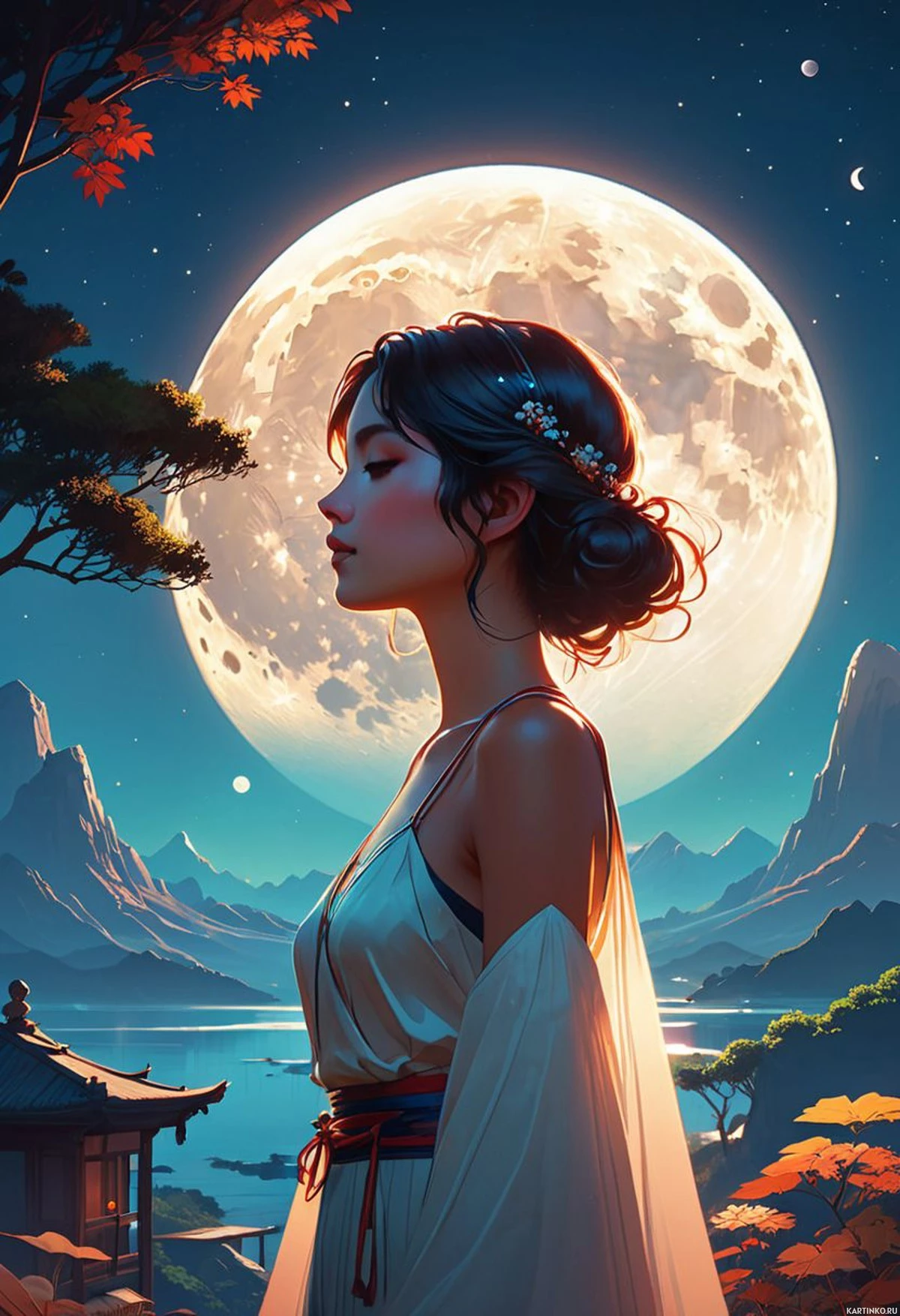 a full moon illuminating her face. Behind her stands a traditional Japanese temple or gazebo, which could suggest that she is in an East Asian landscape during the cherry blossom season, as indicated by the flowering