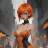 a female character with orange hair and a modern, urban setting. She is wearing tight-fitting, orange-colored