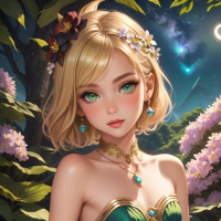 a fantastical setting that looks like a forest at night. There are stars visible in the sky above, adding to