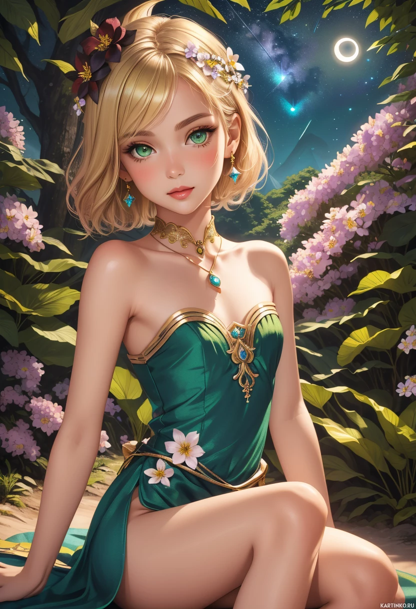 the magical atmosphere. She is sitting down with one leg crossed over her knee and her other foot planted firmly on the ground, giving her a relaxed yet poised appearance. Her expression is neutral, and she has a small flower tucked into her hair, which adds