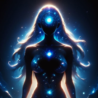 pale skin and is wearing a body suit that appears to be made of crystalline material with blue accents, giving her an otherworldly appearance. Her eyes are closed in a pose that suggests peace or serenity. The background is filled with starry elements, suggesting a celestial or