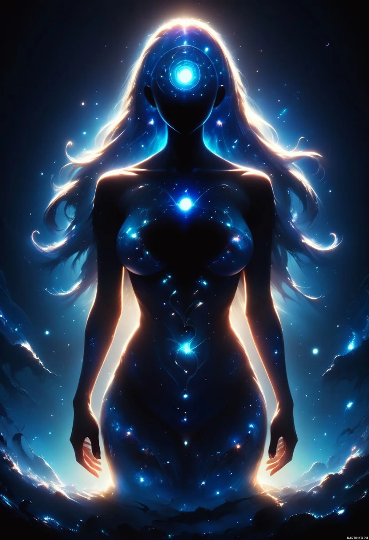 cosmic setting. There's a light source emanating from her