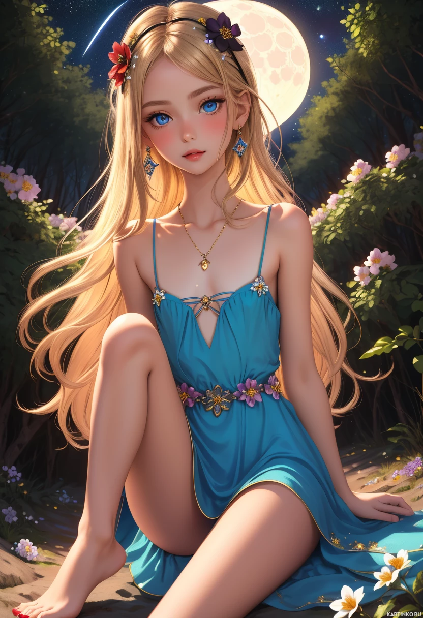 На картинке изображена девушка с золотистыми волосами и поразительными голубыми глазами. На ней сложный, прилегающий костюм, напоминающий наряды из сказочных или эльфийских мотивов, что создает ощущение волшебства и мифологии. Её поза уверенная и грациозная, взгляд направлен прямо на зрителя. На заднем плане — тропинка, ведущая к ночному небу, освещенному полной луной на фоне мерцающих звезд. Вся картинка пропитана атмосферой чарующего и потустороннего мира.